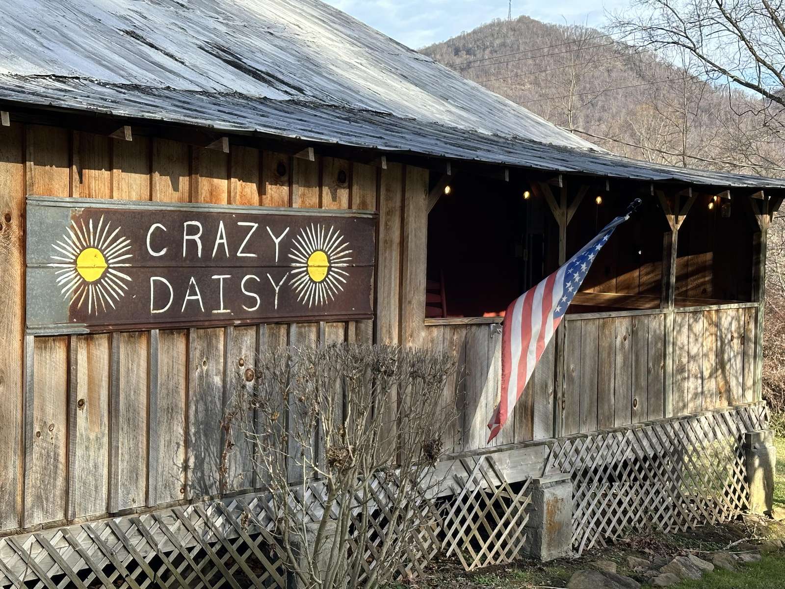 Crazy Daisy is a remodeled 1940s farmhouse with cabin décor. It features electric fireplaces in the living room and bedroom, a king-size bed (no footboard), and a bathroom with a shower. The full kitchen has a granite countertop, refrigerator with ice maker, range, dishwasher, and microwave. Washer and dryer included with towels and linens provided. There's a hot tub on the covered porch, two rocking chairs, and a fire pit for campfires (bring firewood, hot dogs, and marshmallows). Enjoy fast cable Wi-Fi and good cell service, just 10 minutes from the Blue Ridge Parkway and downtown Waynesville, and 30 minutes from Asheville.