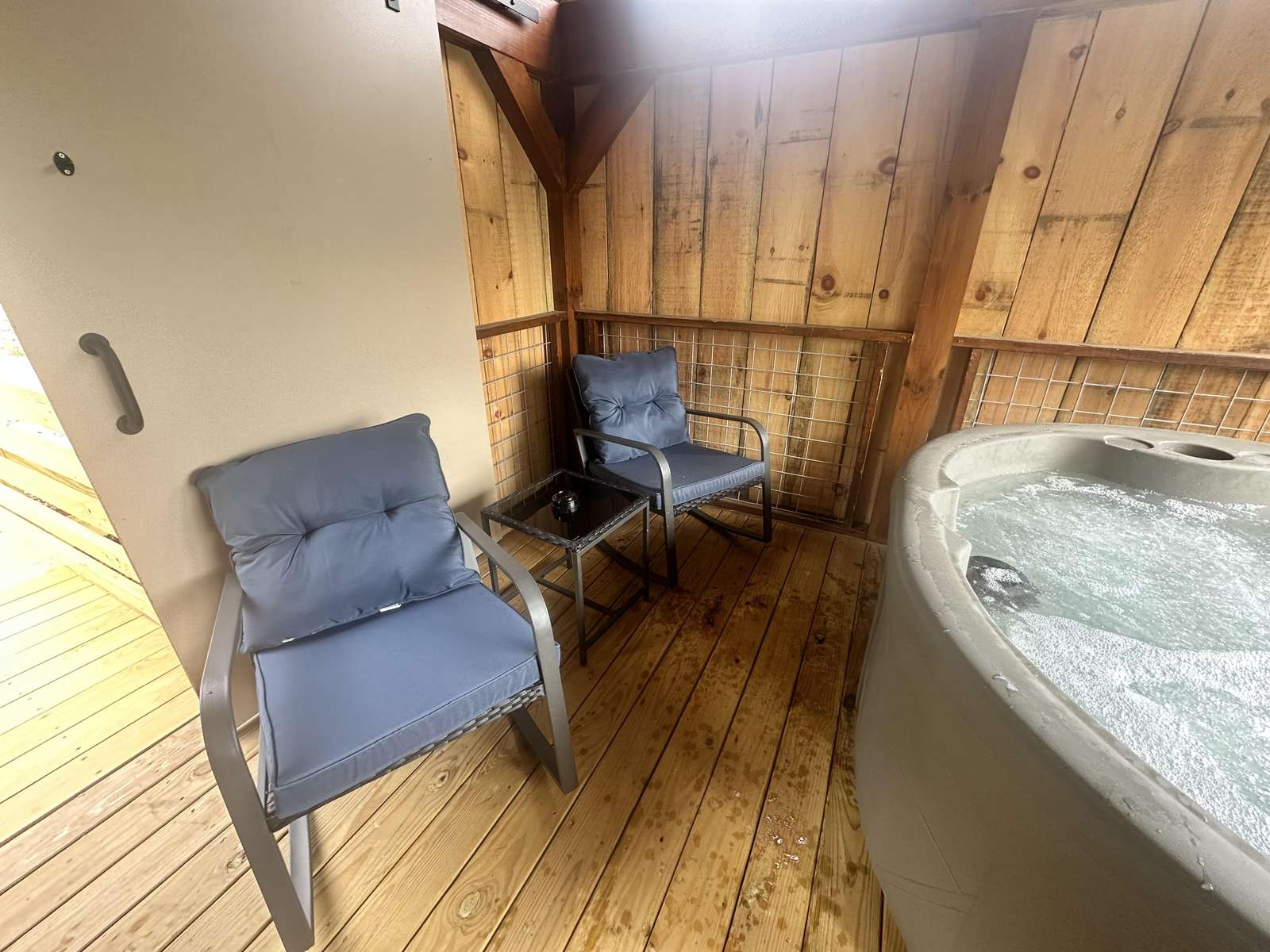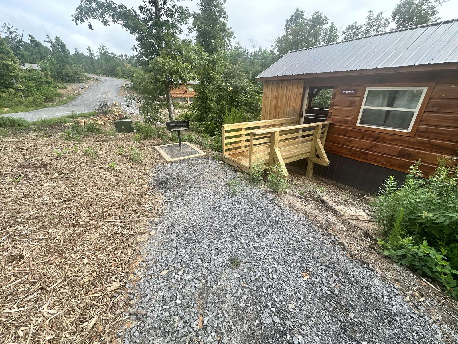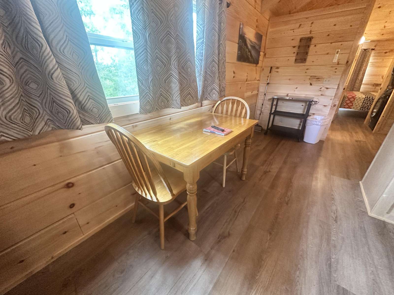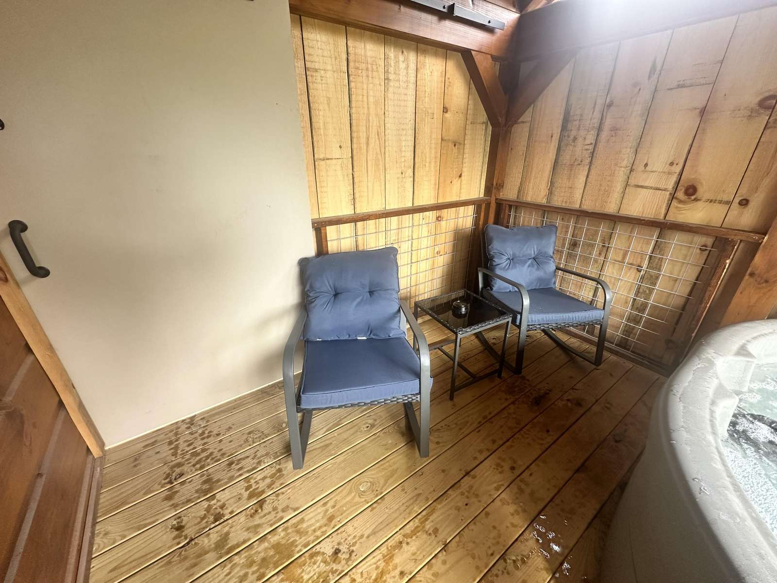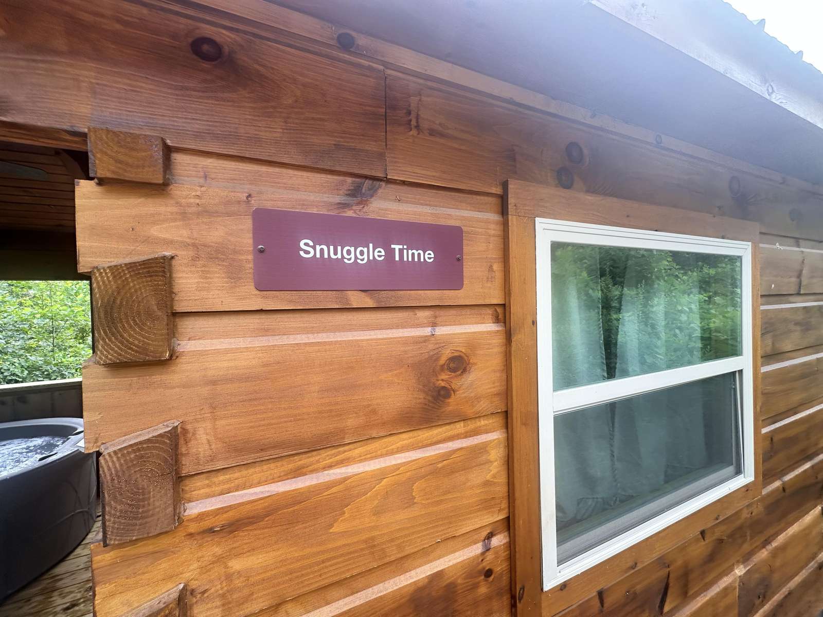 The Snuggle Time cabin has log decor throughout. There is a couch in the living room along with end tables. The bedroom has a King bed with cotton quilt. Cell phone service is Great and the WiFi is super fast in this cabin.Most guest are able to use WiFi calling also while at this cabin. The private, covered porch has a hot tub, two chairs, and a table. This cabin overlooks a pond in the winter time and has a wooded view in the summer time.. This cabin is pet friendly!!! The Snuggle Time cabin is just perfect