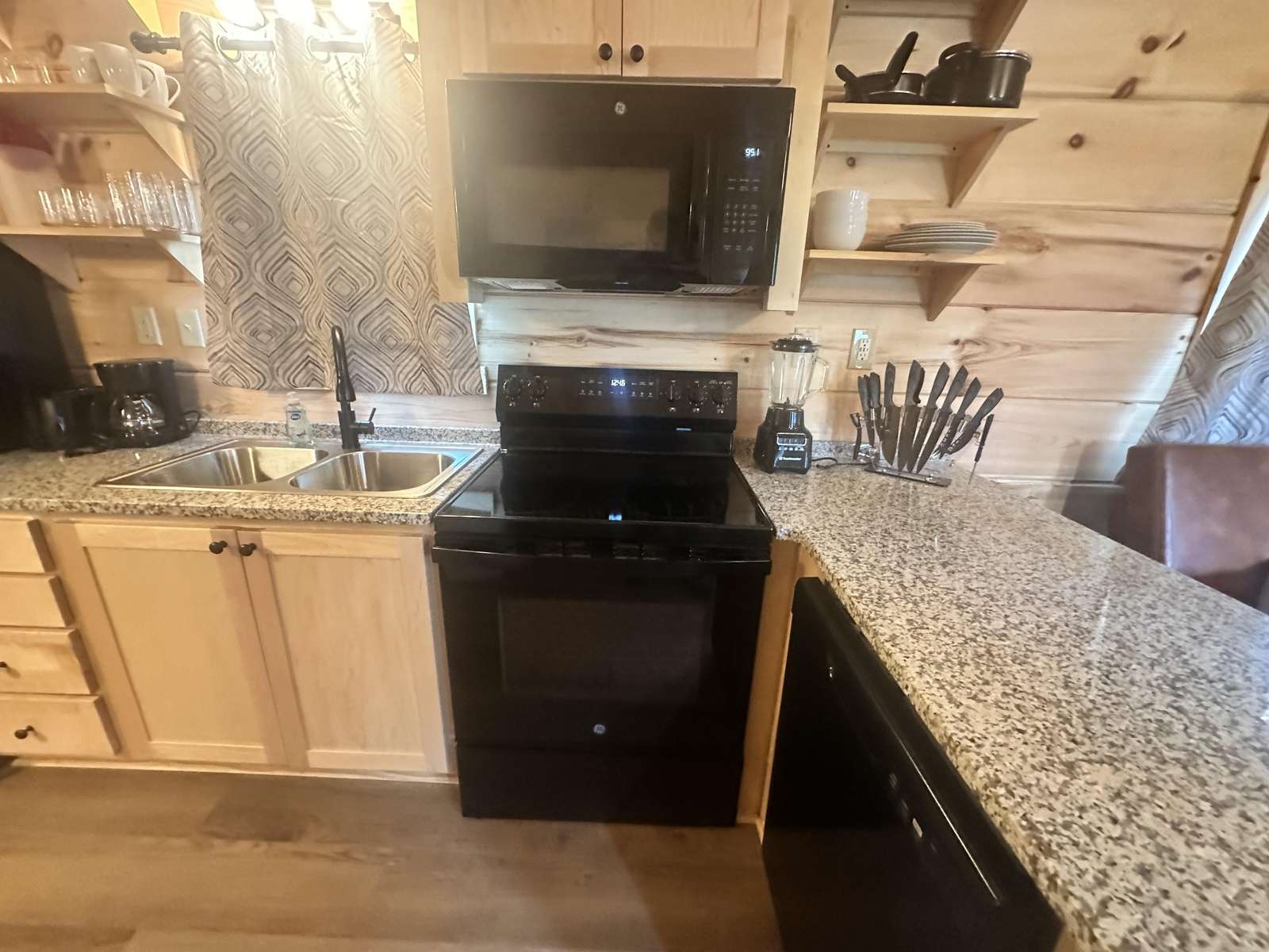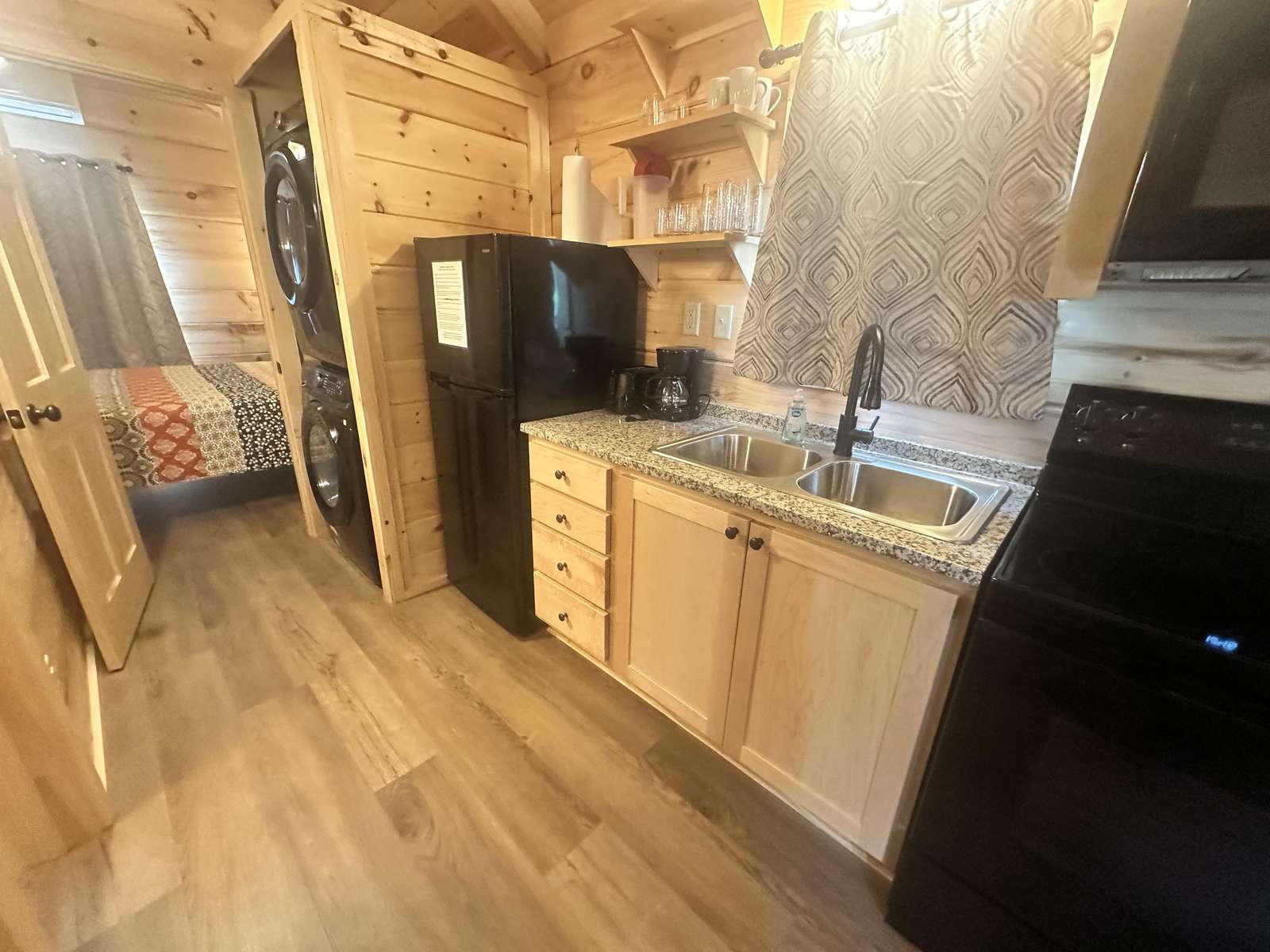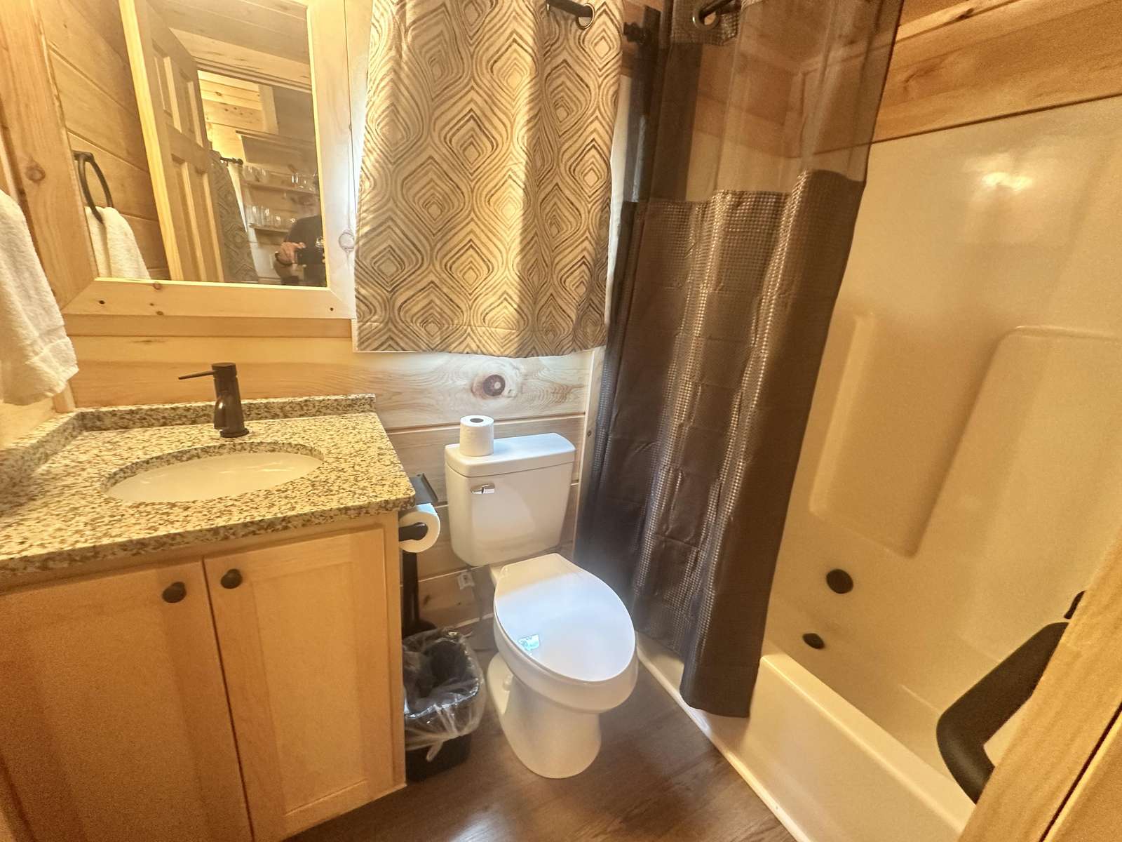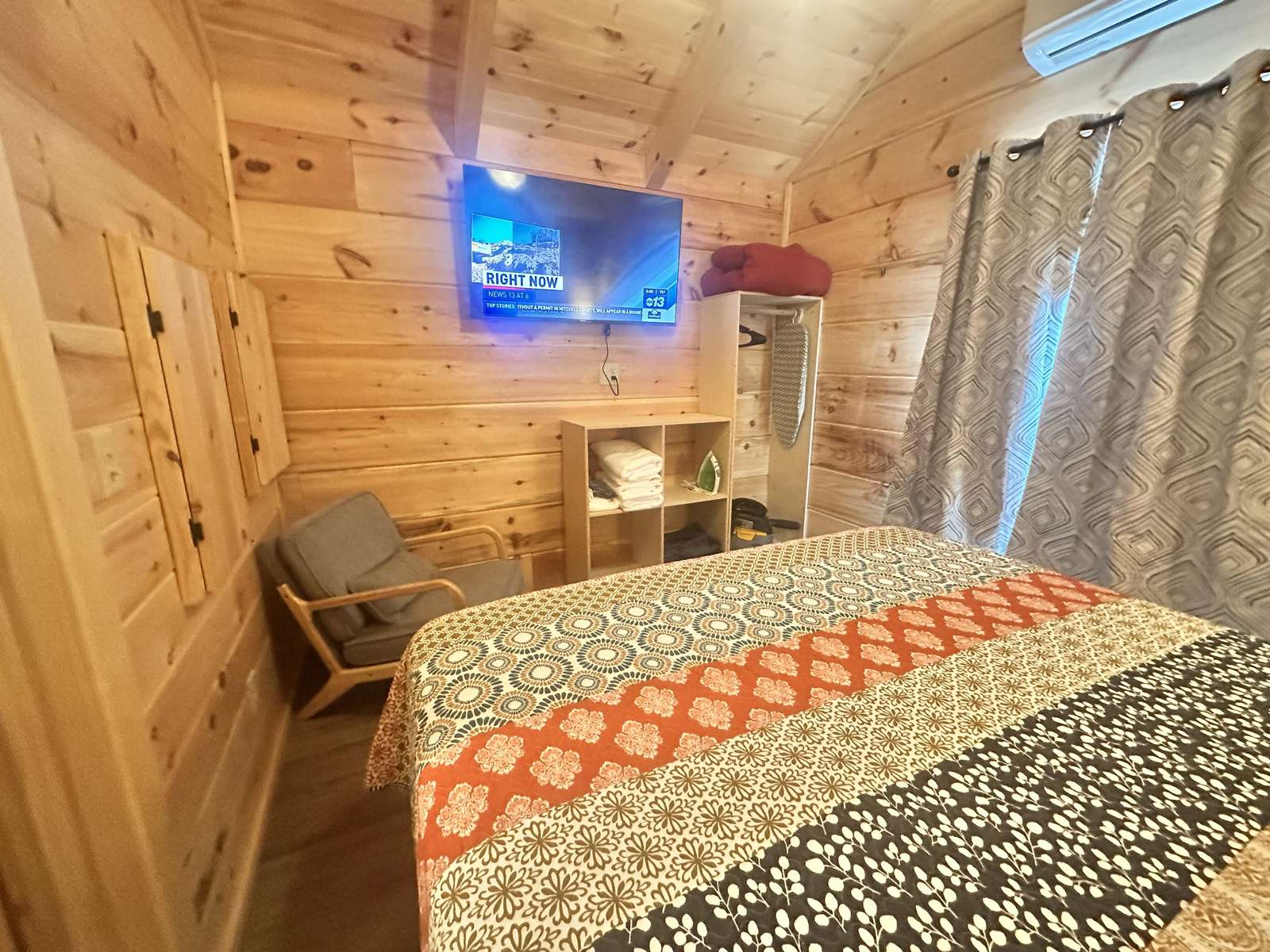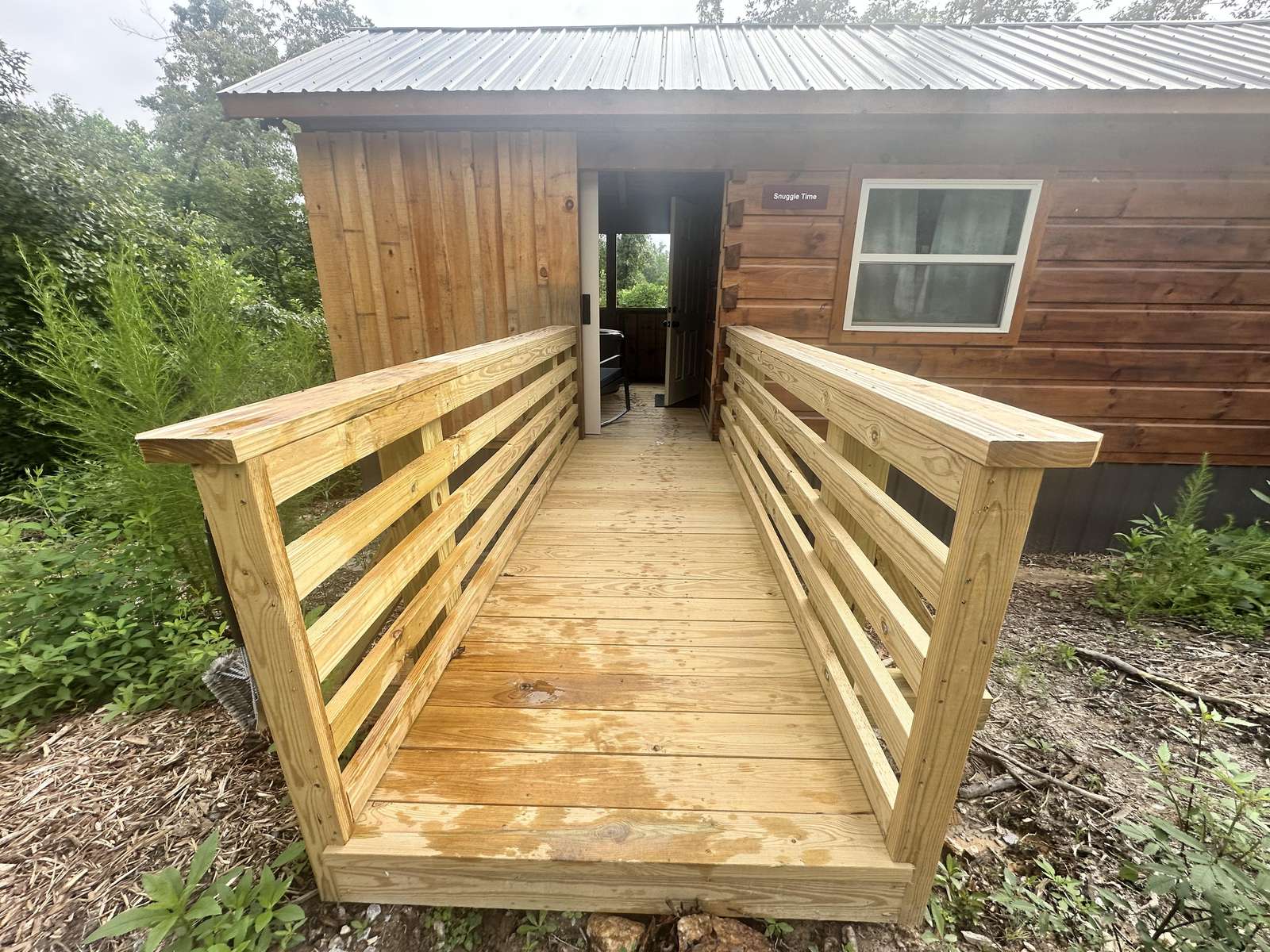 The Snuggle Time cabin has log decor throughout. There is a couch in the living room along with end tables. The bedroom has a King bed with cotton quilt. Cell phone service is Great and the WiFi is super fast in this cabin.Most guest are able to use WiFi calling also while at this cabin. The private, covered porch has a hot tub, two chairs, and a table. This cabin overlooks a pond in the winter time and has a wooded view in the summer time.. This cabin is pet friendly!!! The Snuggle Time cabin is just perfect